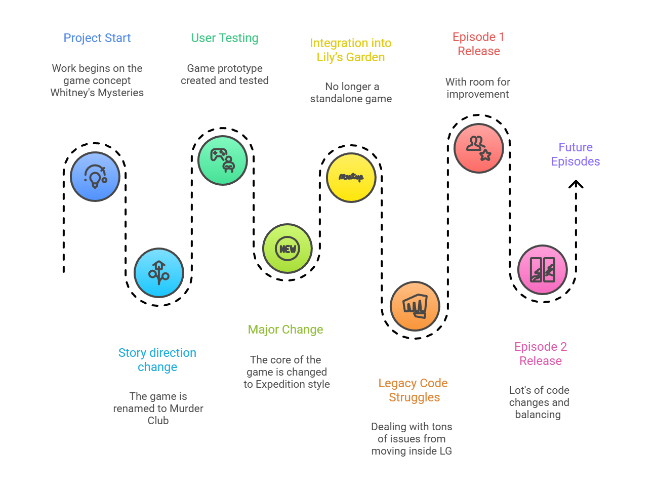 The newly assembled team began working on the game, but the idea for the storyline was still very much in its infancy, so they spent most of the first months nailing down the missing pieces. The initial idea was that, like in Lily’s Garden, the player would be moving around the map and renovating areas, all whilst solving a murder mystery as a part of a Murder Club.