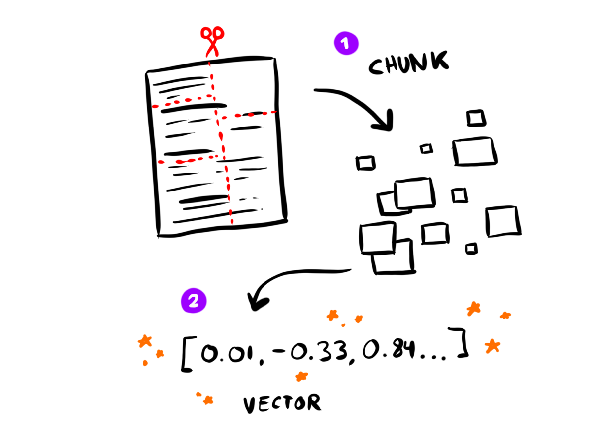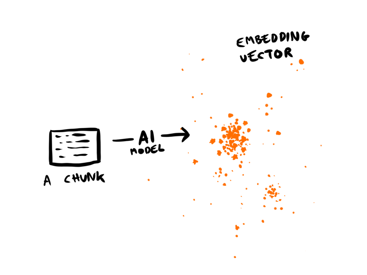 The magical math part of the Docstack (and of most RAG pipelines) is embedding vectors. We send each chunk of content to an embedding service (which is backed by a specialized embedding model), and it returns a long list of floating point numbers (the vector).