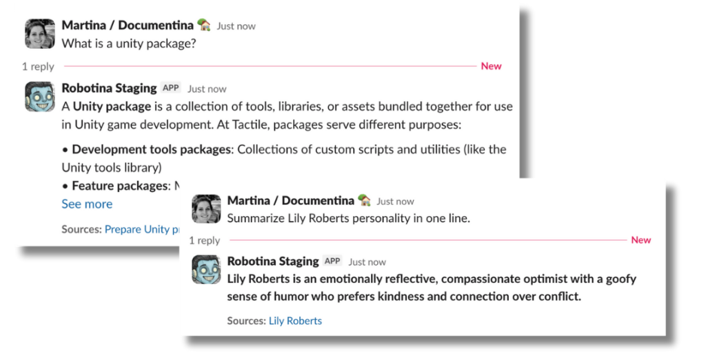 The Docstack is a custom app that (among other things) ingests, analyzes, chunks, embeds, and indexes content from sources such as our wiki, public chats, tickets, and even parts of codebases. The Dockstack data goblins (yes, really – life is too serious) do most of the heavy lifting to ensure that Robotina has access to a nice, clean, unified index of embedded content to search.